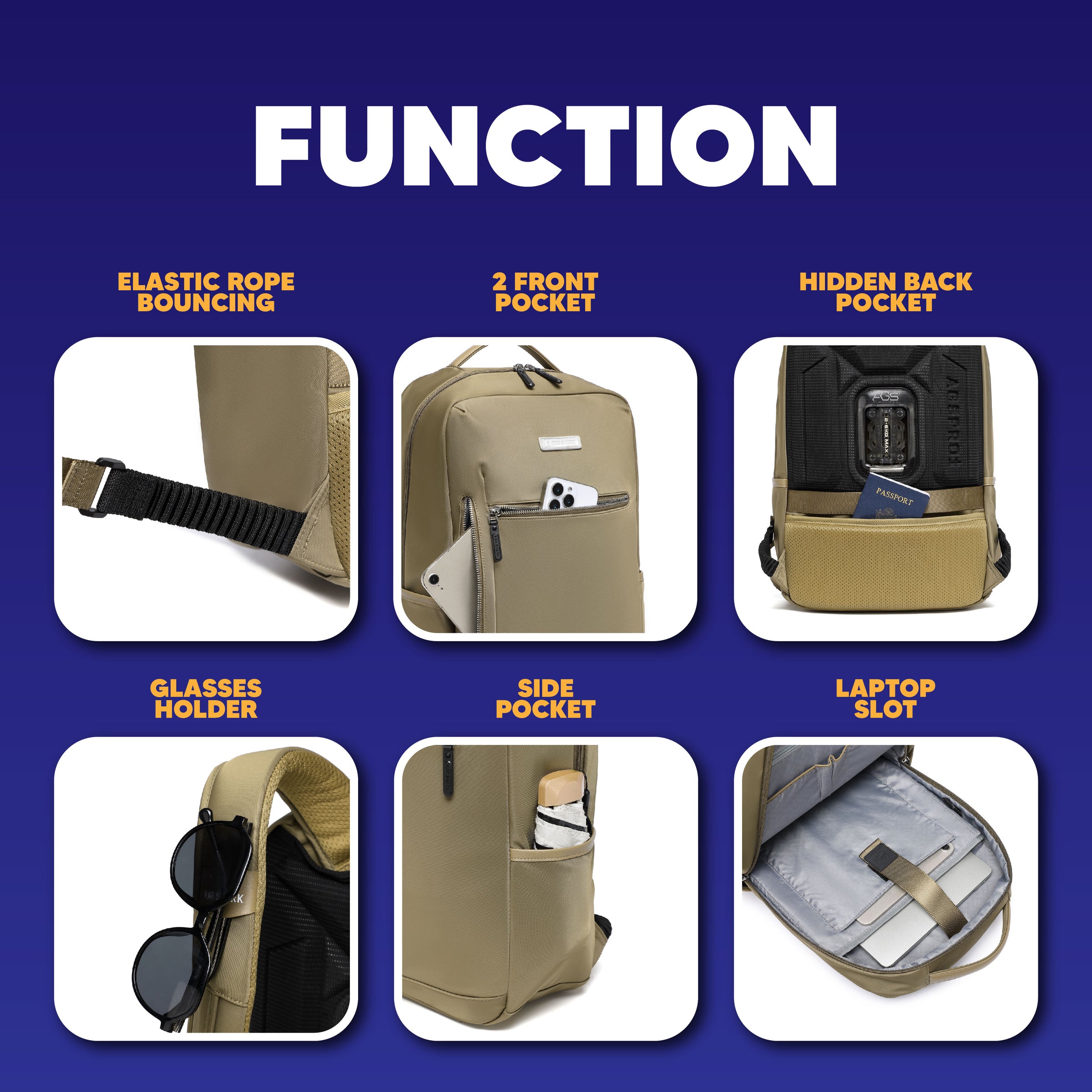 Thoughtfully designed compartments—including dual front pockets, laptop slot, side pocket, and dedicated glasses holder—keep essentials perfectly organized and within easy reach.