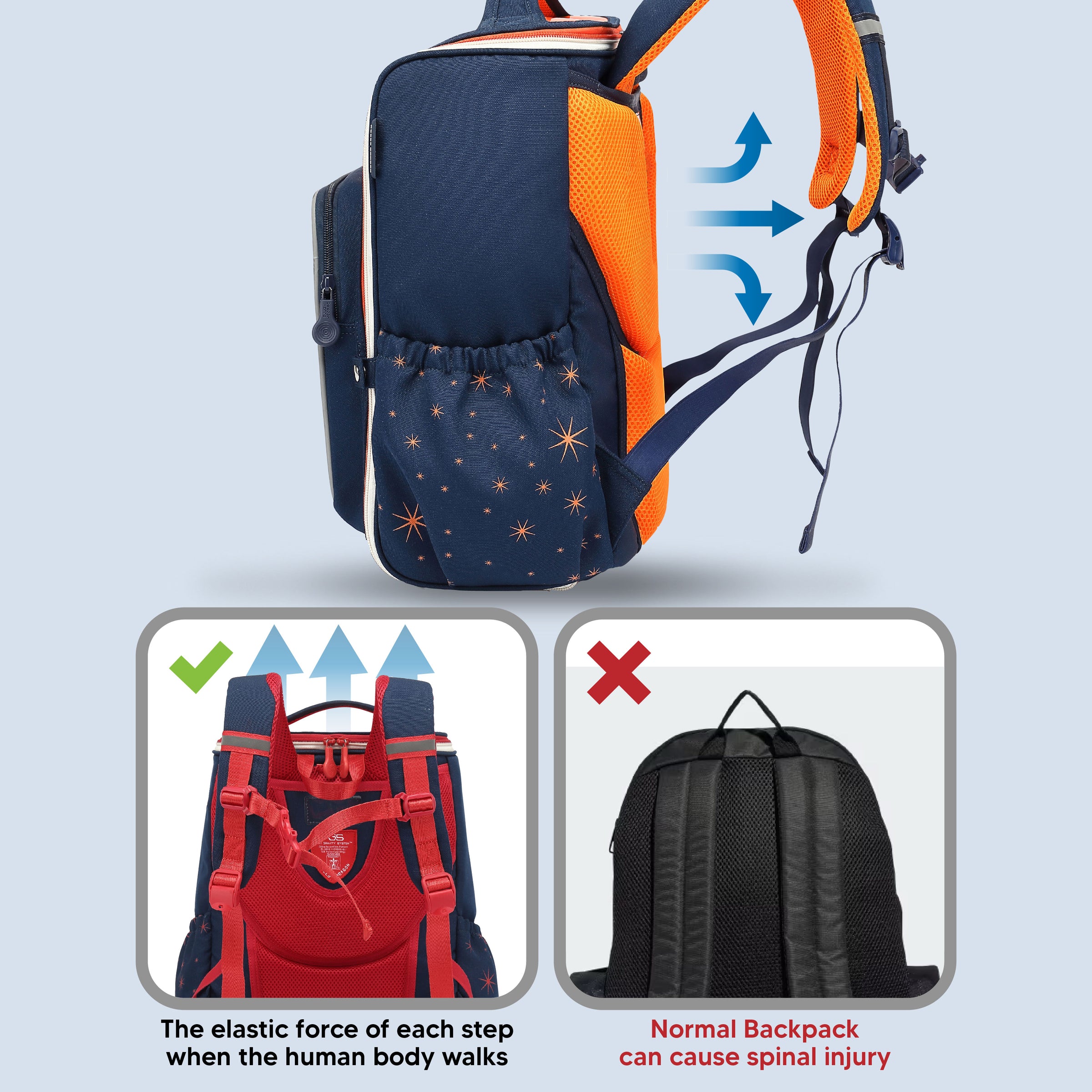 Specially designed elastic shoulder straps absorb movement and return lifting force with each step, easing shoulder pressure and creating a light, buoyant carrying experience.