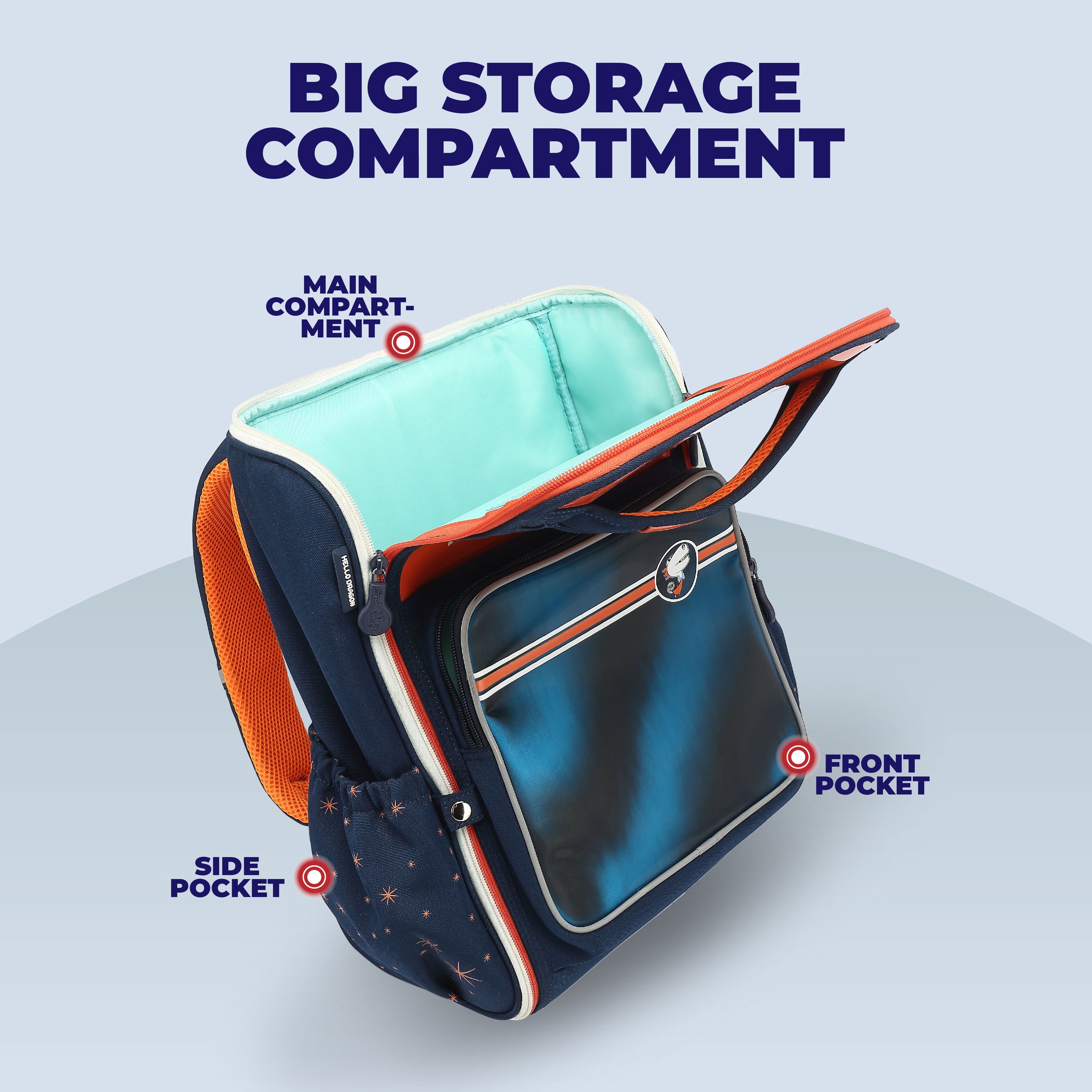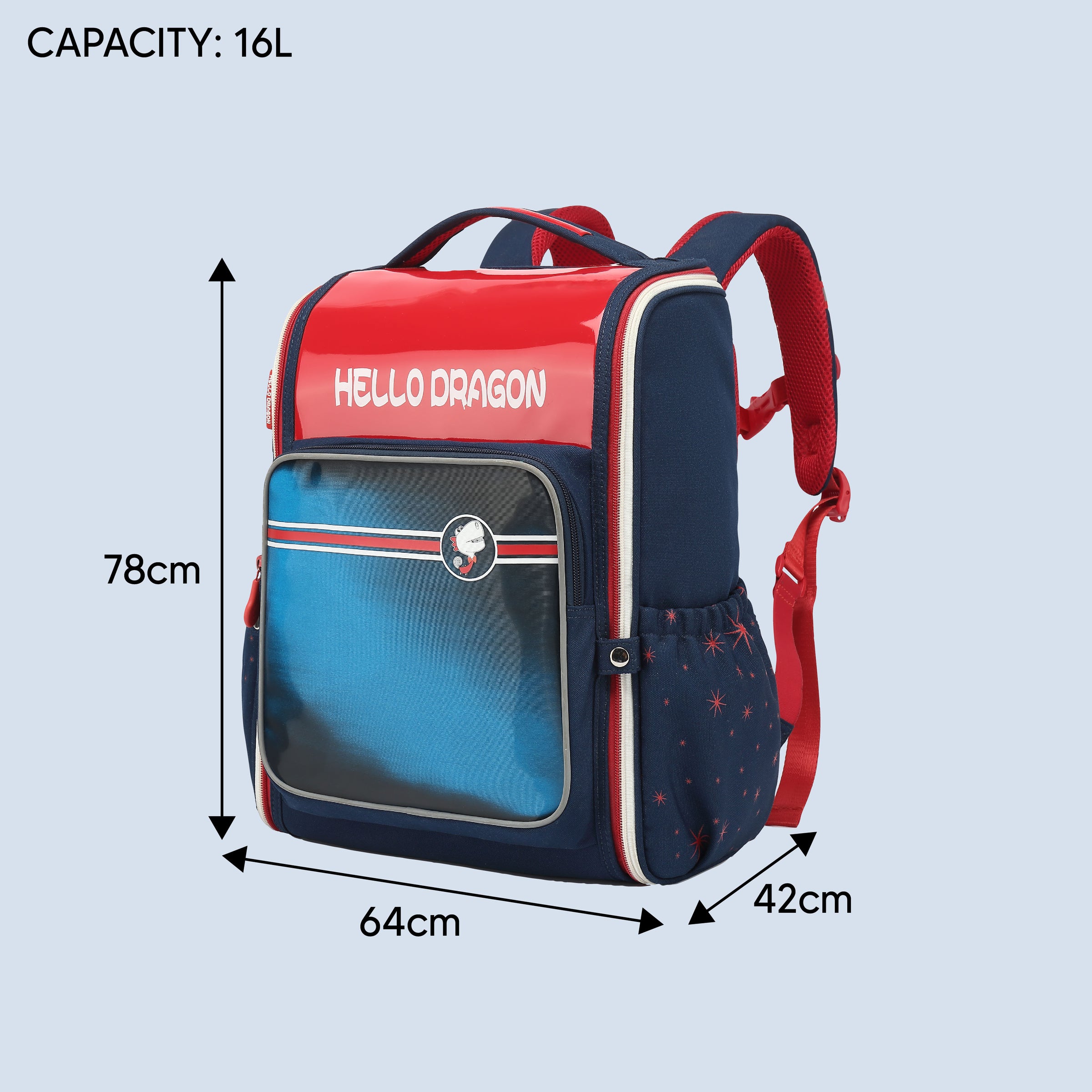 A spacious main compartment, front organizer pocket, and elastic side storage offer seamless organization for books, lunch boxes, bottles, and school essentials.